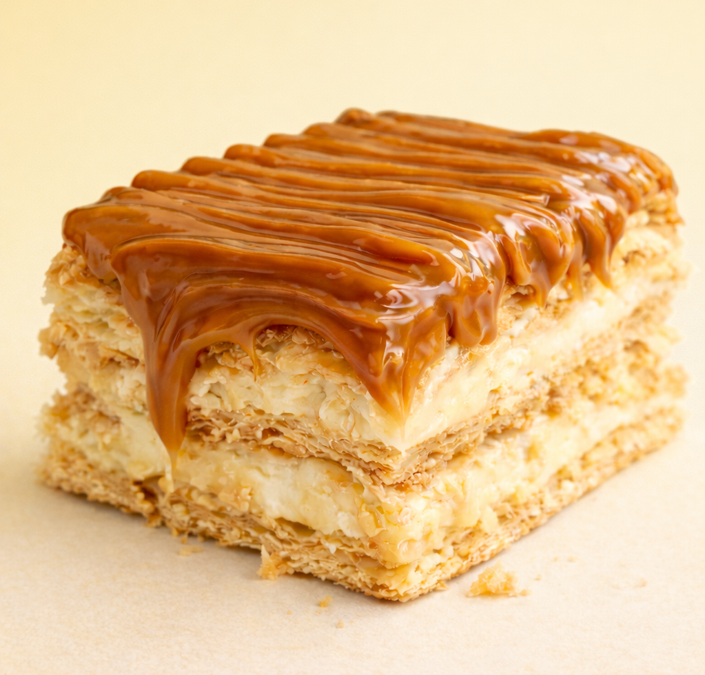 Milhoja de 3 pisos crujiente elaborada a base de Crema Pastelera y Arequipe. ¡Explosión perfecta de sabores!